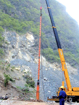 振沖器是振沖法施工中的特制機(jī)具。它產(chǎn)生水平向振動力振擠填料及周圍土體,而達(dá)到提高地基承載能力、減少沉降量、增加地基穩(wěn)定性、提高抗地震液化能力。 振沖法施工時除原地沖器外,尚需行走式起吊裝置,泵送輸水系統(tǒng),控制操作臺等。如工程單位缺乏起重機(jī),本廠還供應(yīng)振沖器施工樁架,樁架有單邊滾管立柱式、液壓步履式、簡易履帶式等。